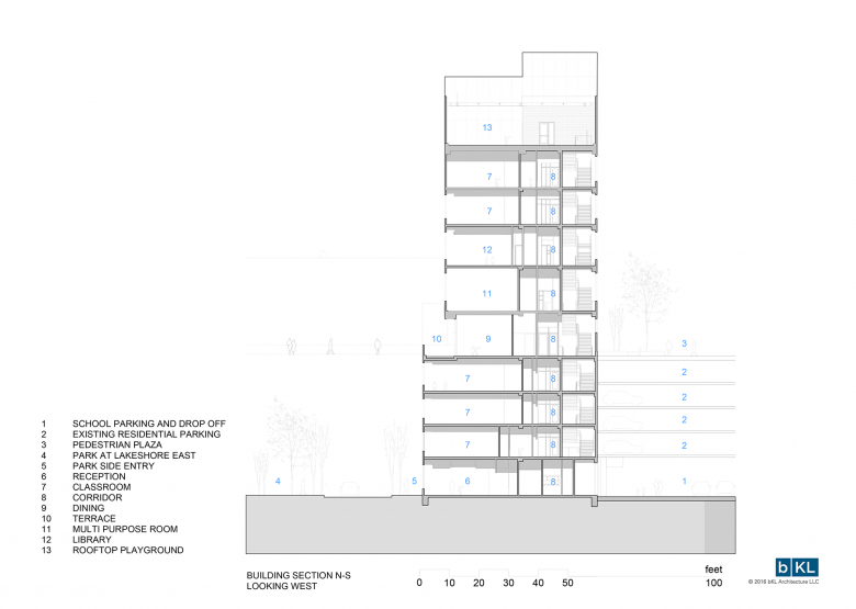 The mid-rise school infills a slim and challenging site at the corner of Lakeshore East Park and takes cues from its surrounding environment. The facility’s stepped massing responds to planned development requirements, established building datum lines, and a bi-level site section. The compact, vertical design addresses limitations of the site foot print, height and setback restrictions, and existing construction abutting its base.