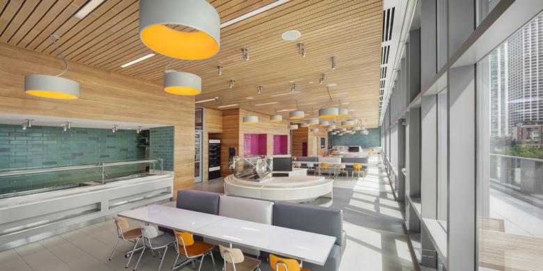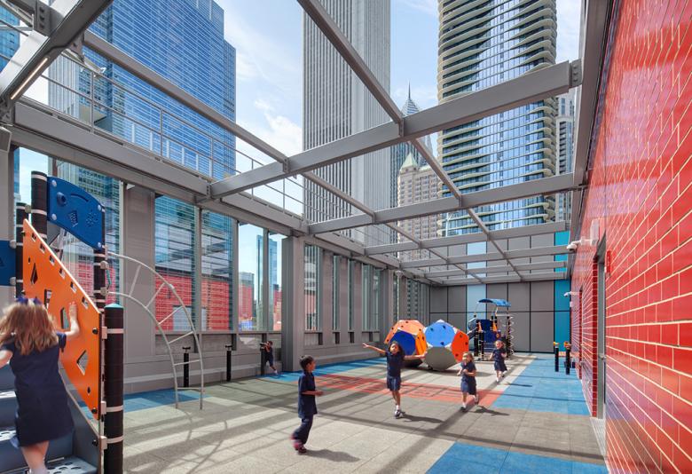 Flexibility, optimized floor area, collaboration and connectivity, and a unified approach to design also drove the interior space features. The building fills the 9,500 s.f. site footprint and the even more compact 7,500 s.f. upper floor plates maximize use of instructional space through careful selection of furniture and installation of perimeter storage. Due to limitations of the size of each floor, a multifunctional approach was considered for the uses of the dining hall and gym (each of which fill nearly a full floor) as well as other instructional spaces. With the restrictions of a very small site, the Lower School has limited outdoor area. The introduction of an outdoor playground at the 10th level enables children to play outside while having impressive views to the Chicago lakefront. Children are protected at this space by extending the curtainwall a full level above the rubber play surface.