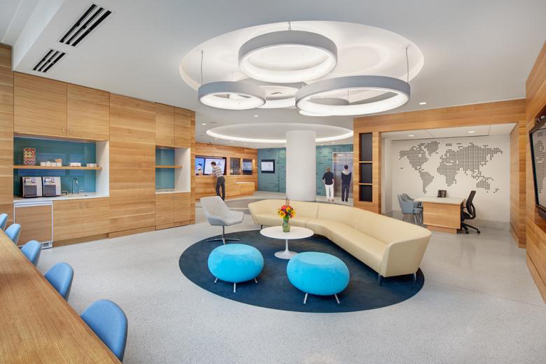 Significant consideration was given to the arrangement of features throughout the building. With a concept of the younger students being located toward the base of the structure, older students toward the top, and all using the central portion, wayfinding features help to differentiate the zones. Selection of materials on walls, floors and furniture assists in identifying each section of the school. The interior design provides a variety of spatial experiences, while maintaining a consistency of detailing, providing strategic use of color, and capitalizing daylight and striking views.