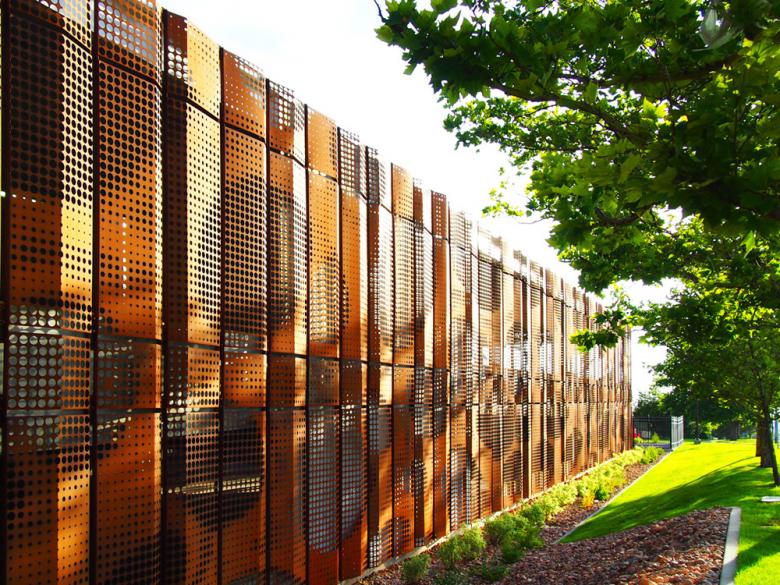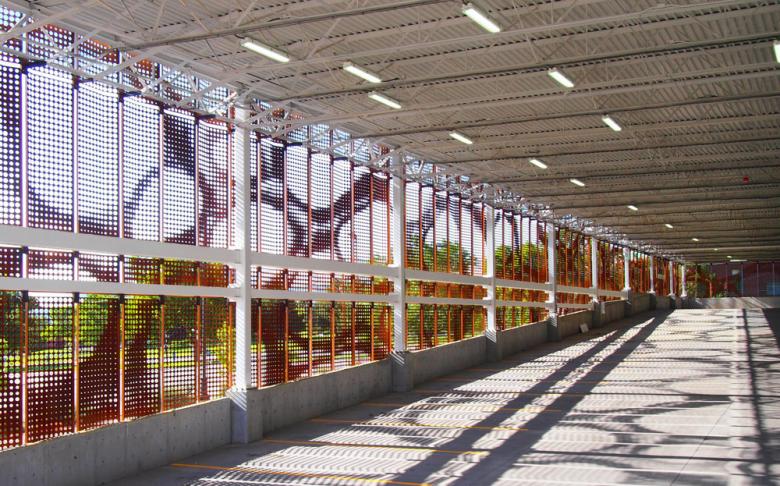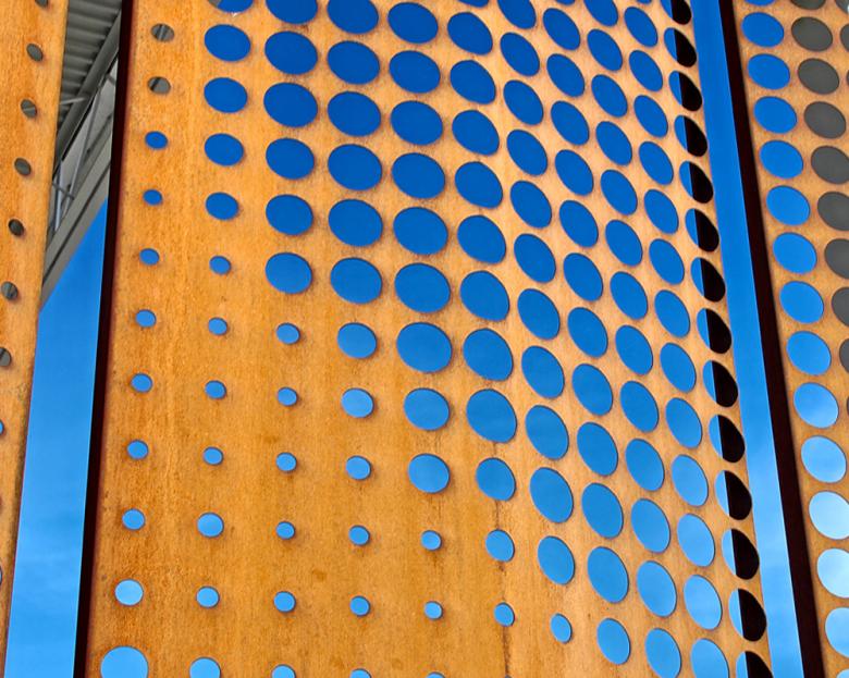 Perforated steel sheets were bent and formed into rigid panels that were then attached to the structure. This allowed the skin to be constructed of a lighter gauge, lowering the overall weight, as well as decreasing the amount of required structural support. As the metal naturally oxidizes, it creates a self-sealed surface which will not spall, discolor, or require repainting. The perforated panels create a unique façade that sets this parking structure apart from any other.