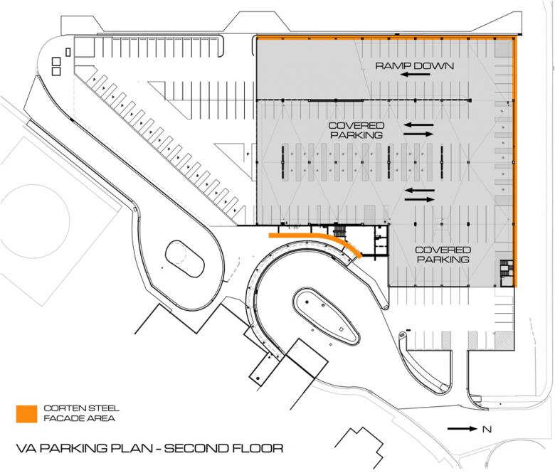 One of the greatest design challenges presented to Axis Architects by the client was to create a parking structure with a solution for suicide prevention and fall protection. Unfortunately, a recent increase in suicide attempts by discharged military personnel made this a necessary element associated with the design of this new project. Most parking structures have large openings, which could allow for possible suicide attempts. The exterior skin of the VA parking structure was designed to prevent this by creating a metal cladding system that creates a virtually impenetrable exterior. Not only do the panels create a striking impression to all that view it, the perforated panels satisfy the ventilation requirements by the IBC (International Building Code) to be classified as an open parking structure.