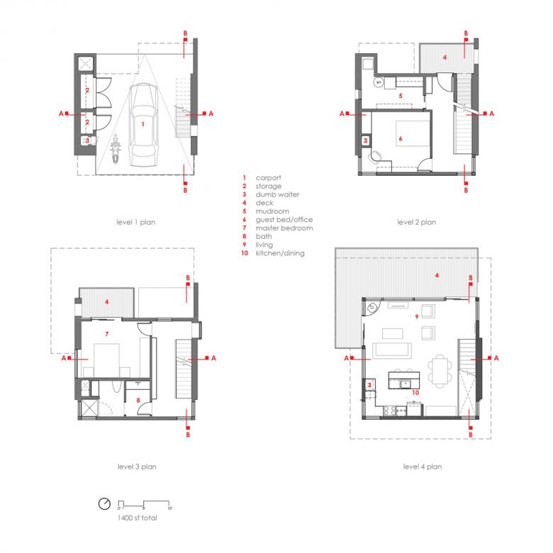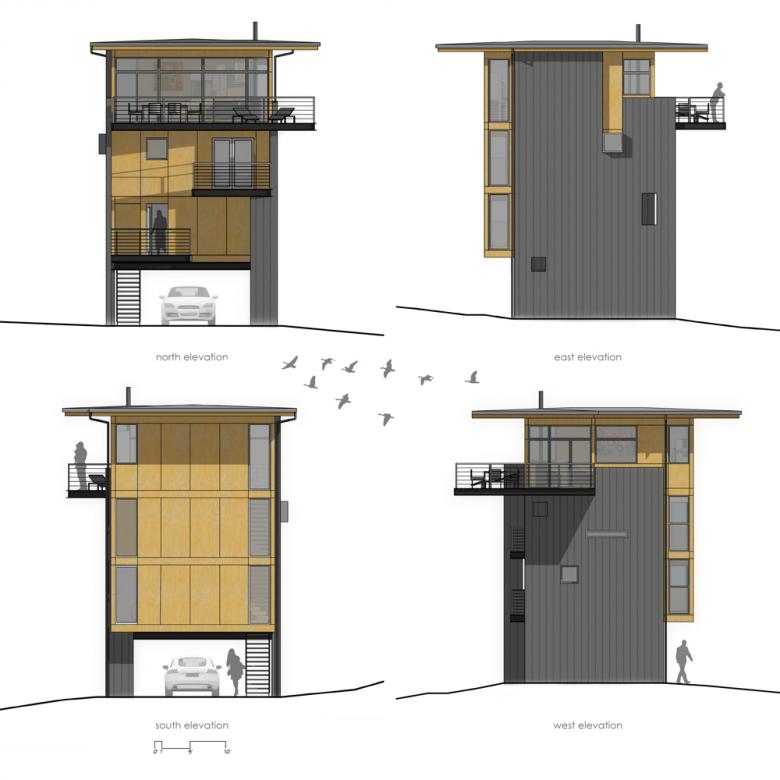 Conceptually, the tower is composed of two metal-clad “fin” walls rising from the crown of the hill with a plywood “box” suspended between them. The metal skin is more opaque, with punched openings. The plywood walls that enclose the stacked interior peel away as they move higher up the tower, culminating at the fourth floor, where window walls with sliding patio doors literally open up the primary living space to expansive cantilevered decks. The plywood and metal-clad elements are stitched together by a more delicately textured steel stair that moves from exterior to interior and from more to less private spaces as it ascends the tower.