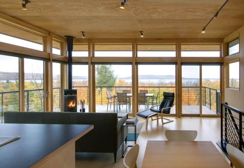 Residential architecture in rural Michigan must balance the seemingly opposed requirements of sheltering inhabitants from a climate of thermal extremes and celebrating the beauty of the surrounding lakes and woods. The owners of Glen Lake Tower House truly love this special area of northern Michigan. The design reflects their desire to invite the landscape in through extensive glazing and expansive decks at the topmost floor, yet still feel enclosed in the comforts of home. These twin goals are achieved in practical ways through intelligent construction, insulation, quality windows, and durable materials. Just as importantly, the meticulously detailed, birch-lined interior enhances the sense of the house as a special, protected refuge.