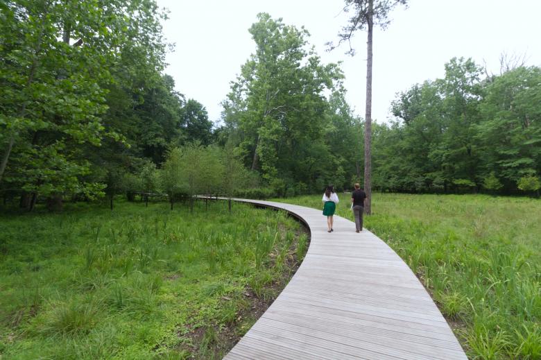 Visitors to Glenstone leave their cars at the Arrival Hall and from there head off on foot along the main path, which meanders through a gorgeous landscape laid out by PWP Landscape Architecture and leads directly to the Pavilions. A few outdoor sculptures, the original Charles Gwathmey-designed Gallery (2006), and the Patio building with café are also found in this central, more manicured area of the property. To get to the Serra Pavilion, visitors must venture onto the Woodland Trail, which cuts a counterclockwise arc through its namesake woods, past a trio of Andy Goldsworthy Clay Houses and alongside a stream that formerly defined the eastern edge of the property. After a good fifteen minute walk along the Woodland Trail, there is a bridge that crosses the stream and connects to a wooden boardwalk that eventually delivers visitors to the door of the Serra Pavilion. The boardwalk is not straight though; it meanders, much like the main path, opening up vistas of the wetlands, meadow, and woods, with occasional shrouded views of the pavilion in the distance. The time spent in nature seems to ready one mentally for the experience of the Serra installation.