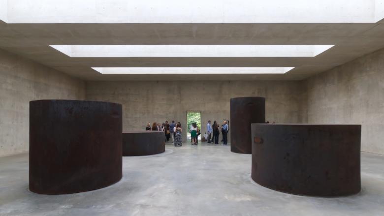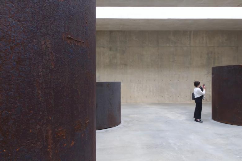Following the long trek across the grounds of Glenstone and through its woods, my first thought on entering the Serra Pavilion was of the dramatic disconnect between being immersed in nature and then being immersed in a box almost totally cut off from nature. Nevertheless, nature is there in the sunlight that enters from above, in the air moving through the gaps between the concrete roof and the glass skylights, in the framed view of trees back through the door, and even in the insects that occasionally hold onto the sides of the steel cylinders (I saw a couple during my time there). Put another way, the nature that is there is harnessed, albeit subtly, to create the ideal conditions for experiencing Serra's Four Rounds, which is the third Serra piece installed at Glenstone, following Sylvester (2001) and Contour 290 (2004). It is the first Serra not set entirely outdoors at Glenstone, though all three were executed in his signature Corten steel.