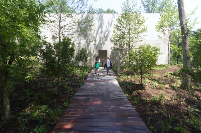After spending time with the sculpture and returning to the meadow and boardwalk outside, the relationship between the landscape and the architecture of the pavilion — so disconnected from each other, initially — became clear. The walk to the pavilion, especially the section through the Woodland Trail, had elevated the senses: the sounds of bees buzzing and the water trickling in the stream; the colors and forms of the trees; and the smells of the rain letting up that afternoon. This was the readiness I mentioned earlier: a readiness to confront Serra's sculpture with all of one's senses, and also to consider it as another element of nature. Conceptualized by an artist, here nature was harnessed and forged by industry, turned into forms exhibiting as much subtle variation on them as is found on the leaves and the bark on the trees outside. Phifer's new container for Serra's artwork says as much — and does it simply.