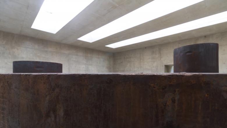 Glenstone's statement on Four Rounds asserts that the artwork "is as much about the negative space in which the viewer stands as it is about the objects themselves." While this is evidently true in regards to the placement of the four pieces relative to each other, this assertion heightens the importance of the box in which the sculpture is installed. Put Four Rounds in an empty meadow, or inside four walls open to the sky, or in some other architectural or natural situation, and the effect of negative space would be dramatically different than the result carried out by Phifer in collaboration with Serra. The concrete walls provide space around the cylinders but also bring visitors close to them. The four skylights are the same number as the cylinders, but their rectilinear forms stand in geometric contrast to them, ultimately serving as the only significant mark of the architect relative to the artist. The concrete surfaces are beautifully executed, bearing an industrial appearance that serves the artwork so well that one's perception of the concrete container recedes in favor of the weathering steel — its colors, textures, and many imperfections.