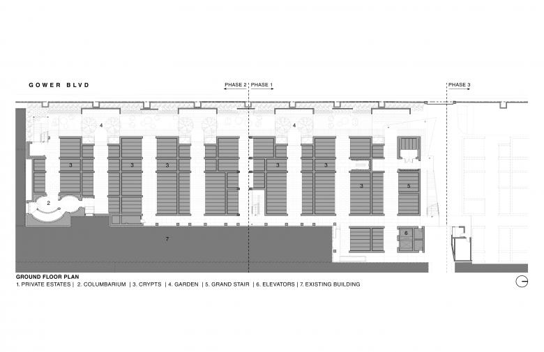 The verticality of each 20-foot-high level stacks crypts eight high, preserving scarce ground while establishing a cultural and spiritual landmark. Poured-in-place concrete features geometric patterns and contrasting quartzite crypts, with cantilevered volumes enhancing Gower Street’s architectural presence.