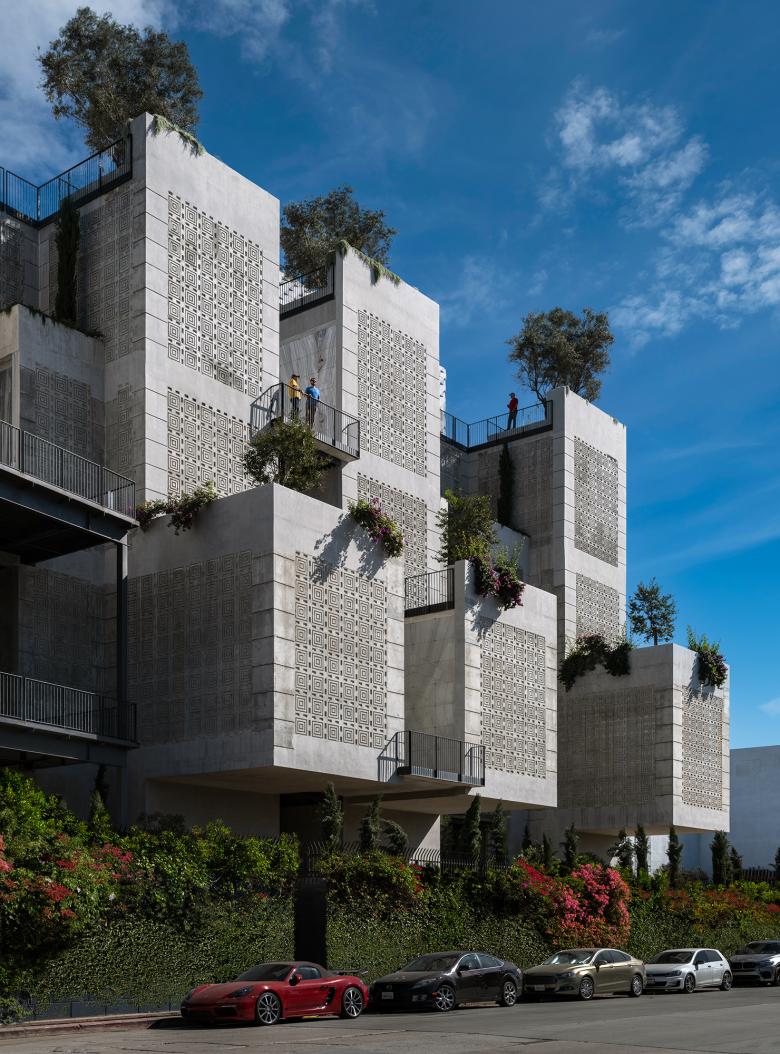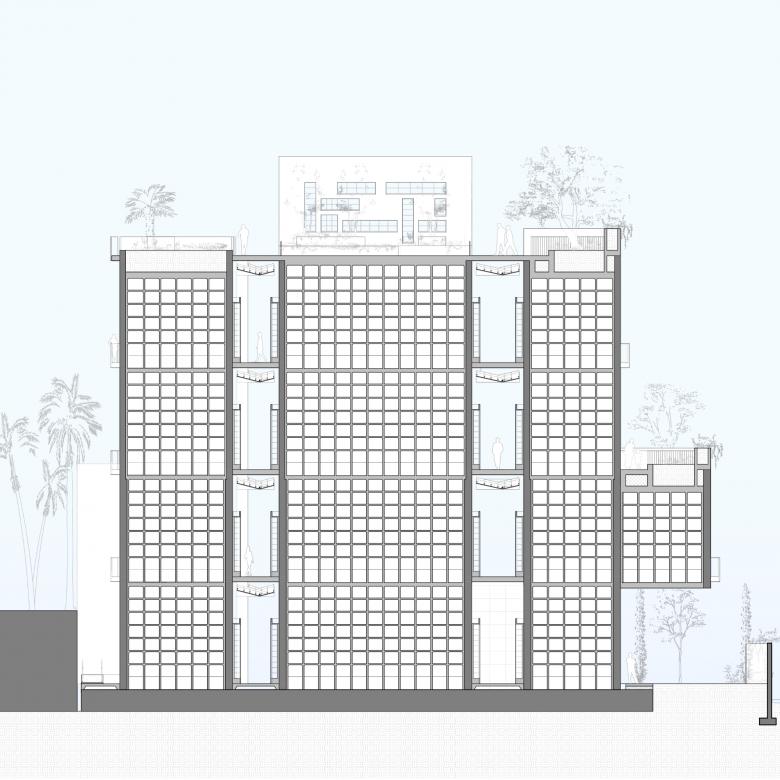 Stepping down to the neighborhood, the concrete towers incorporate terraces, gardens and cantilevers that extend the lush green grounds to the neighborhood and create a new image and expression for the cemetery.