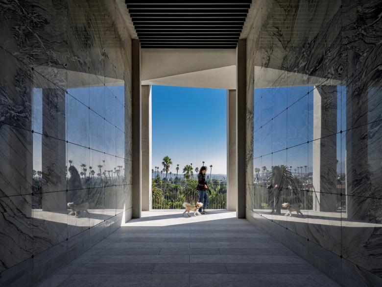 MBL: This project began as a real estate proposition. How much real estate are you allowed, or can you be allowed, to create so it can be sold to house people for burial places? It was clear to us from the beginning that an enormous building (in this case ultimately 500 feet long and 100 feet high) full of dead people in the middle of any city, in this case in the center of Hollywood, could be a problem. Making it beautiful and a place that profoundly enriches the community and the cityscape was critical. The mausoleum is conceived as a vertical topographical landscape that both complements and riffs on the cemetery’s flat, parklike setting. Our goal was to make it a destination of desire for our fellow Angelenos, somewhere that honors the full cycle of life. Given that people stop visiting the deceased within a few years of their passing, we wanted to build somewhere that future generations would want to visit.