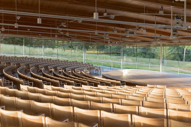 The most generous spaces within the River Building are the 700-person Sanctuary and the Court. Like the other pond-like volumes under the covered walkway, the spaces are capped by exposed glulam beams, but the beams in these two spaces are so long they had to be shipped by a route around the Rockies from British Columbia. The full-height glass panels were manufactured in Germany and curved in Spain, then assembled on site with the smallest of silicone joints. These exacting details are indicative of those used throughout the project toward increasing the sensation of the building merging with the landscape. A literal merging will occur in planned custom furniture to be made from the trees felled from the site due to the building's construction.