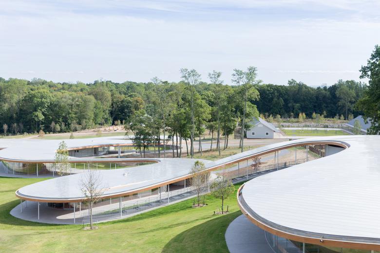 The Foundation selected SANAA, the duo of Kazuyo Sejima and Ryue Nishizawa, in 2010, shortly before they received the Pritzker Architecture Prize. In 2012 they unveiled the meandering design that recalled previous SANAA buildings, particularly the Glass Pavilion at the Toledo Museum of Art, but also those Oscar Niemeyer realized at Pampulha in Brazil more than sixty years ago. Yet where SANAA stakes out their own claim is in the technical advancements that give the impression that their buildings are lighter than air. The River Building's roof – wood on the underside, metal on top – is as thin in reality as it was in the 2012 renderings, while the crystal-clear curved glass walls effectively disappear at times.