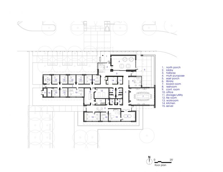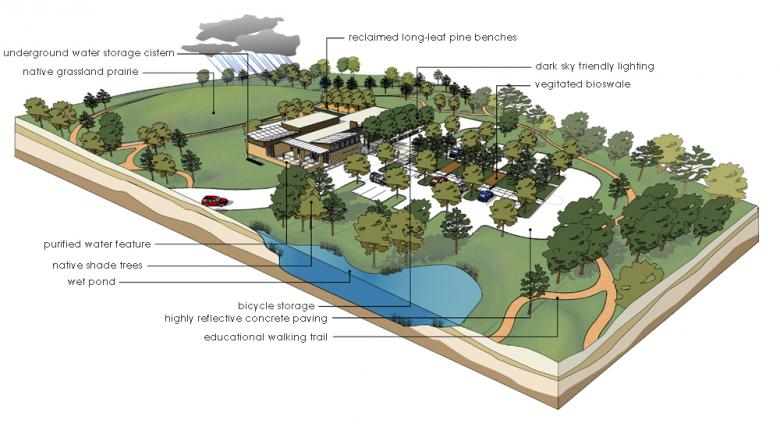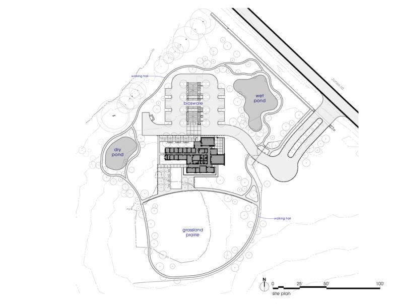 The existing site presented the challenge of creating a “sense of place” in what most would call “the middle of nowhere”. With no immediate built context, our site strategy relies on a series of orchestrated landscape interventions to transition from the surrounding rural setting to the building. The large retention pond at the approach and the restored prairie of native grasses and trees provides a new context for the building.