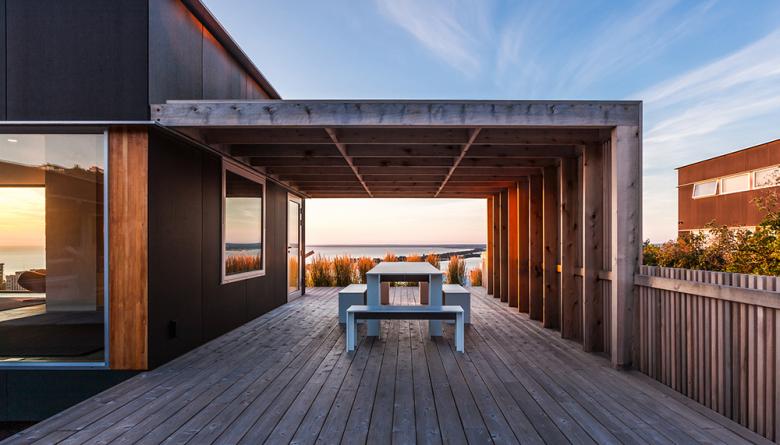 It is sustainable in its maintenance-free material selection (Richlite panels) as well as in insisting for maximum passive attainability.