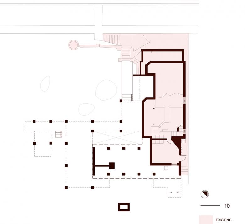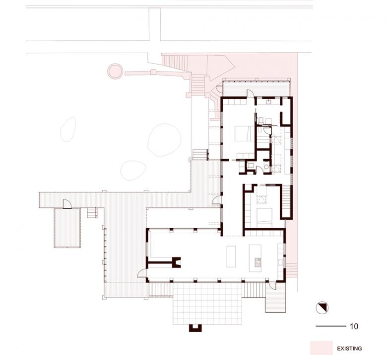 It was an extension of the logic & vocabulary of our existing complex. With the relative difficulty of constructing on ledge rock, effort was given to utilize several existing elements such as foundations, retaining walls and site stairs (all stained white) and to construct simple masonry piers for the addition.