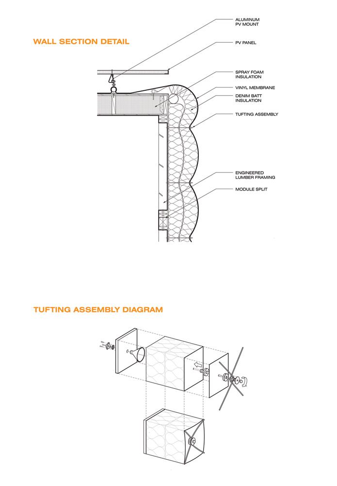 The greatest challenge for the SCI-Arc/Caltech team was to materialize the experimental concept into reality. Through intense research, planning, and testing both digitally and physically at model scale or on our full-scale mockup in the SCI-Arc parking lot, we were able to persevere and bring forth a house without sacrificing the conceptual intent that we deemed important. Despite having a detailed BIM, we anticipated the technical difficulties that would arise with the fabric exterior that could only be resolved during construction. For example, determining how much insulation would be required at certain locations of the house in order to produce the desired puffiness appearance.