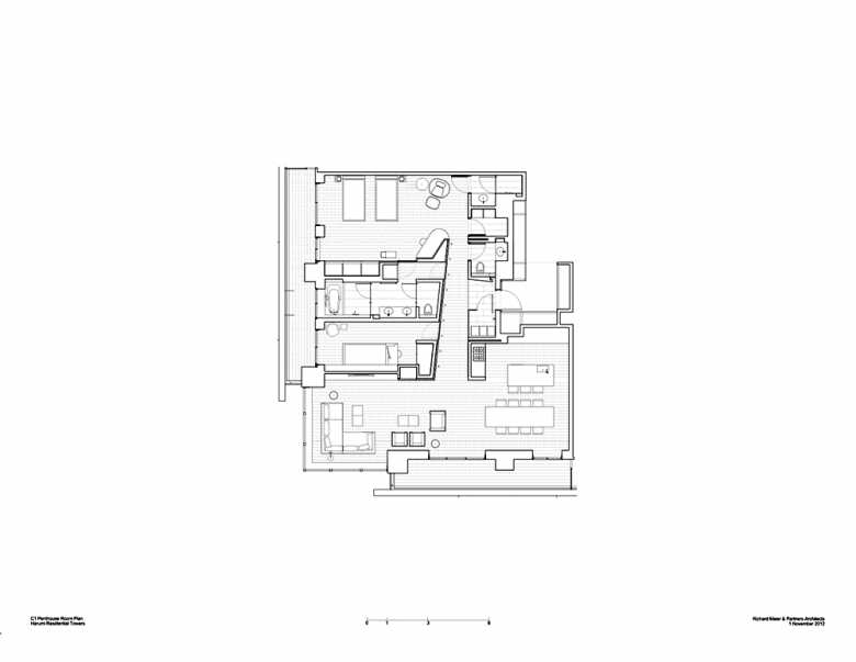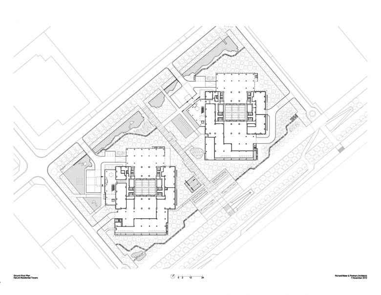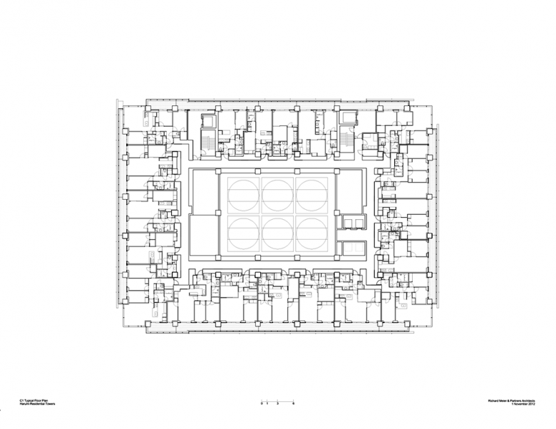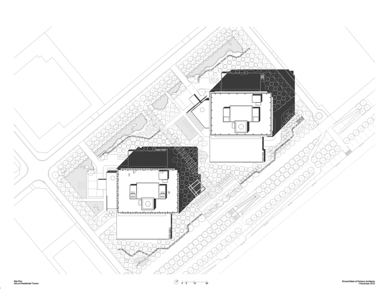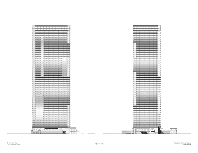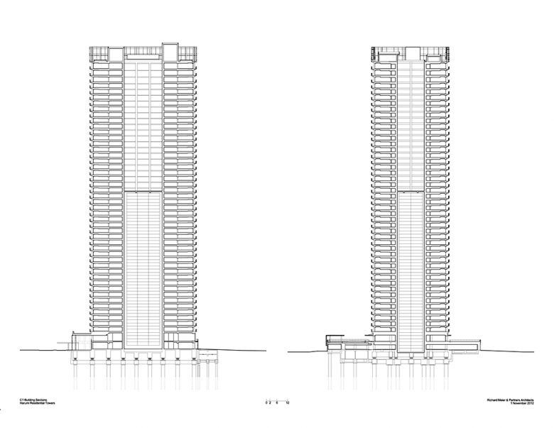 Richard Meier & Partners Architects LLP was invited and selected from a short-list of three international firms by interview and office visits by Mitsubishi Estate Group for the Harumi project.