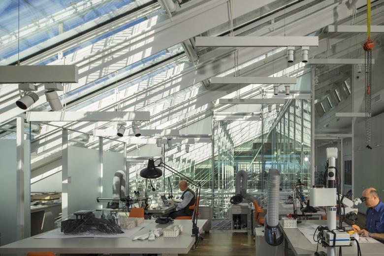 Galleries and study centers are being significantly expanded; as befits their importance to the mission of the museum, the study centers are at the center of the building on level four. The conservation lab will continue to occupy the top of the building, above the study center under the new sloping glazed roof.  Public amenities, and support spaces for special events will be enlarged and modernized, and include an auditorium of 294 seats at basement level.