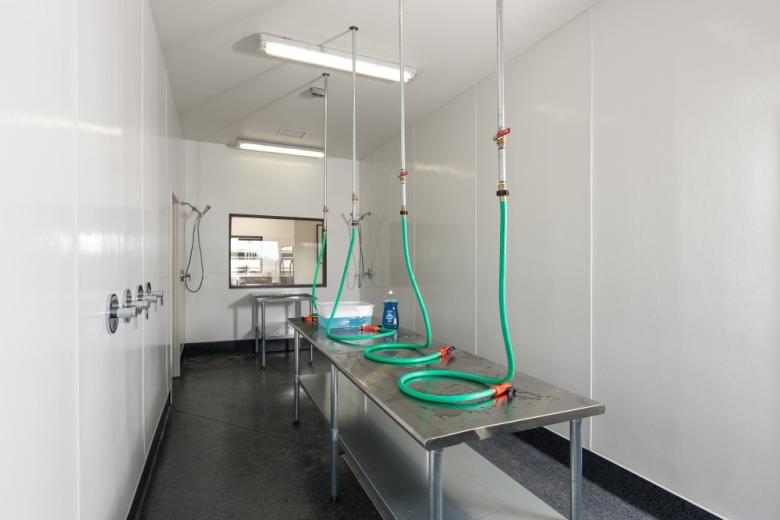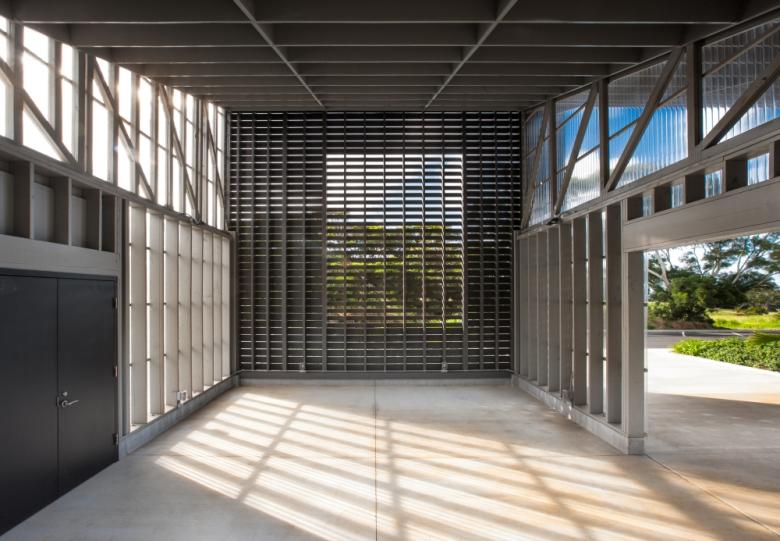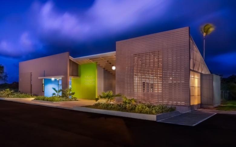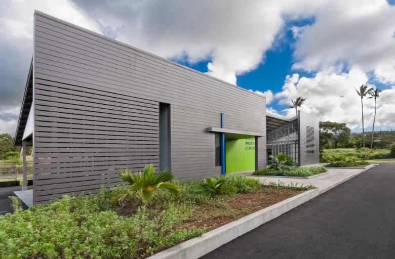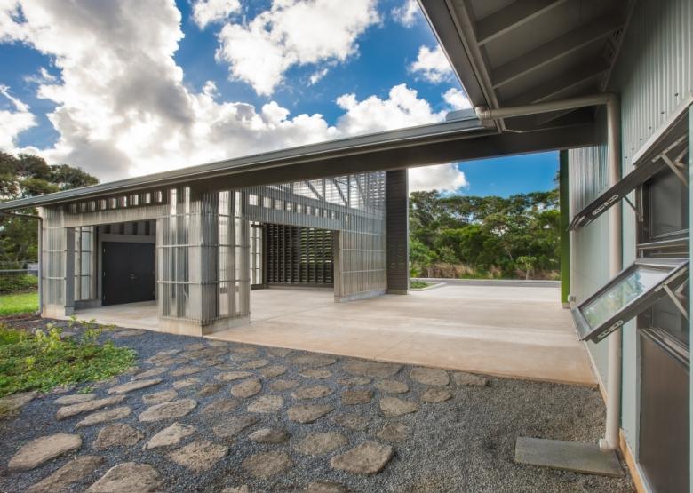 The building's form is an abstraction of the archetypal Hawaiian plantation architecture, with a planar front elevation concealing simple shed- and gable-roofed volumes behind. In its materiality, the horizontal siding references vernacular cladding, but variations in the siding dimension and spacing allow the building to be entirely naturally cooled by the steady trade winds. The facility operates on a net-zero basis annually thanks to a rooftop PV (photovoltaic) array.