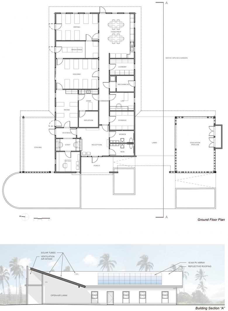 The HWC director and I worked side by side to determine the ideal sequence of spaces and critical adjacencies. The building’s form grows directly from that effort, but also responds to natural forces such as solar orientation and prevailing trade winds. The HWC director and I also researched precedent facilities in the San Francisco Bay area (none existing in the islands) and through an international network of wildlife emergency response experts.