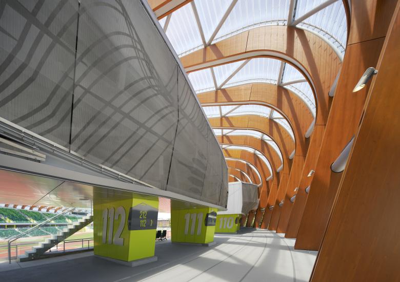 Hayward Field is made up of three primary components: the base, the seating bowl, and the roof canopy. The base, which encloses the training and team facilities and supports the stadium’s concourse above, is clad in precast concrete panels that ground the building visually from all sides. The precast panel shapes are trapezoidal, all leaning in the direction of the runners on the track, which is a nod to the theme of movement. The Stadium bowl was lifted off the main concourse to maximize fan flow and to open the stadium to views and daylight. Clad with a metal mesh screen on its underside, the bowl became a canvas for branding and connections to the site’s history, visible to all from the public concourse and beyond. The soaring wood roof canopy structure was inspired by the Pacific Northwest and is a nod to Hayward Field’s historic wooden grandstands. Often stadium environments are dark and in shadow because of solid roof structures and materials. The ETFE roof was chosen to allow daylight in.