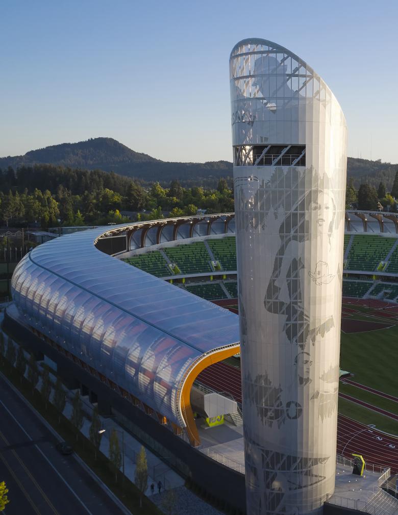 Hayward tower marks the main entry and serves as a campus and community-wide landmark. The interior includes coaches’ amenities, offices and meeting rooms and the public open upper deck enjoys a 360-degree view of Eugene and the surrounding valley. The tower’s steel form flares upward and outward to resemble the Olympic torch, a fitting nod to the success Oregon Athletes have had and will continue to have on the Olympic stage. The perforated metal panel exterior of the tower features imagery of five Oregon track-and-field icons: legendary coach Bill Bowerman, Steve Prefontaine, Raevyn Rogers, Ashton Eaton, and Otis Davis.