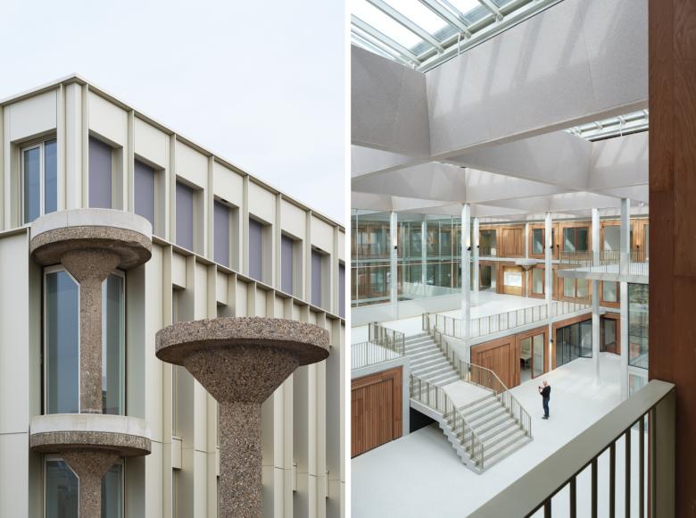 We brought the 1980 building into the year 2025 by using the design principles that the architect Joop van Stigt originally used. His ideas of structuralism were reinterpreted. We kept the facades, the parking garage, and the structure with the beautiful columns. We also decided to connect old and new by reusing the existing Californian redwood ceilings, making acoustic wall panels out of them. The old ceilings are now used in the central atrium embodying the connection between old and new. Furthermore, we decided to reuse entire columns from the middle houses to build the 3500 m2 extension, and old wooden staircases were reused in other buildings.