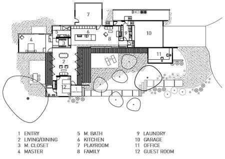 Due to code restrictions we were constrained to incorporate an existing structure within a new design.  We tried to find a pattern within the existing house that could lead to a set of rules to unify the new design.  Our approach was to delineate the East and West facing walls in plaster, and the North and south facing walls in wood.   We emphasized the “T” shape of the existing house by extending it to the north.  This plan gave us two exterior courtyards that would become outdoor living areas.