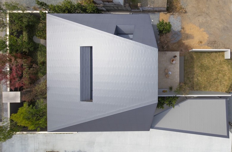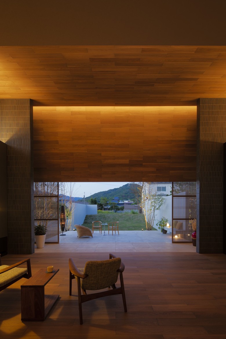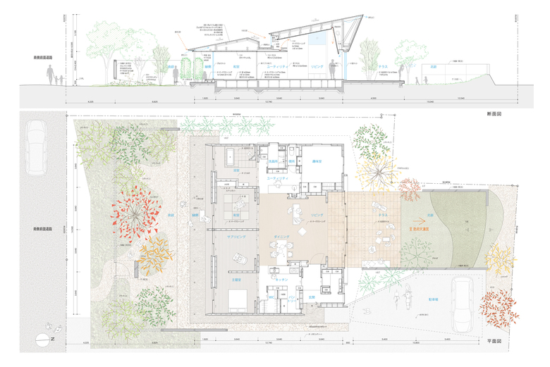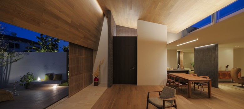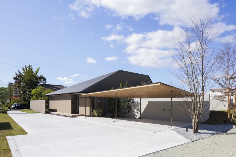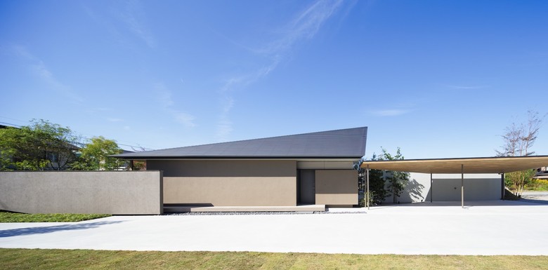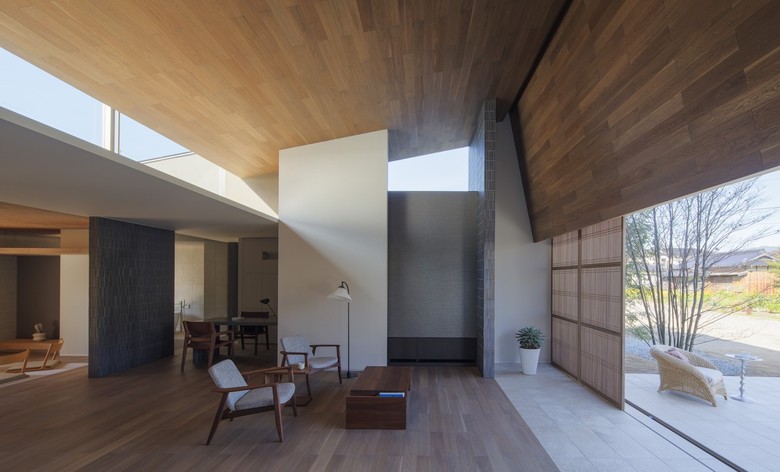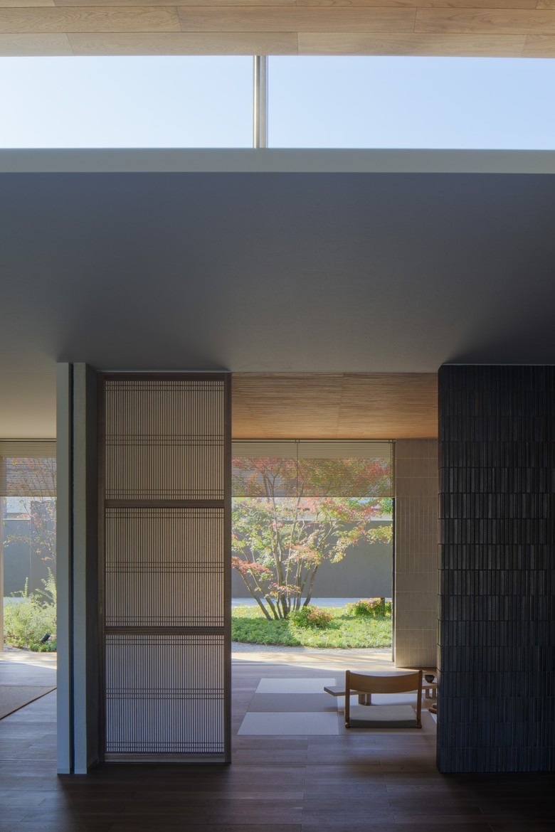 The garden on the peaceful north side features a manmade hill in the garden that shortens the perceived distance to Tenmangu, drawing the gaze in that direction and creating continuity with the green mountains. We utilized a single-story layout with no solid interior partitions so that the residents could enjoy views of both gardens from anywhere in the home. A large roof consisting of a single plane, almost like an extension of the earth, unifies the interior spaces. Extending up and to the north, the roof points both the exterior of the house and the living room in the direction of Tenmangu, the symbol of Hofu.