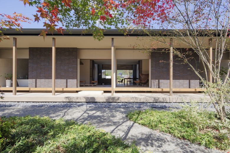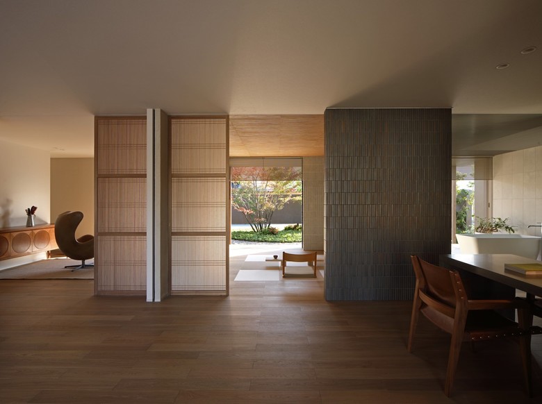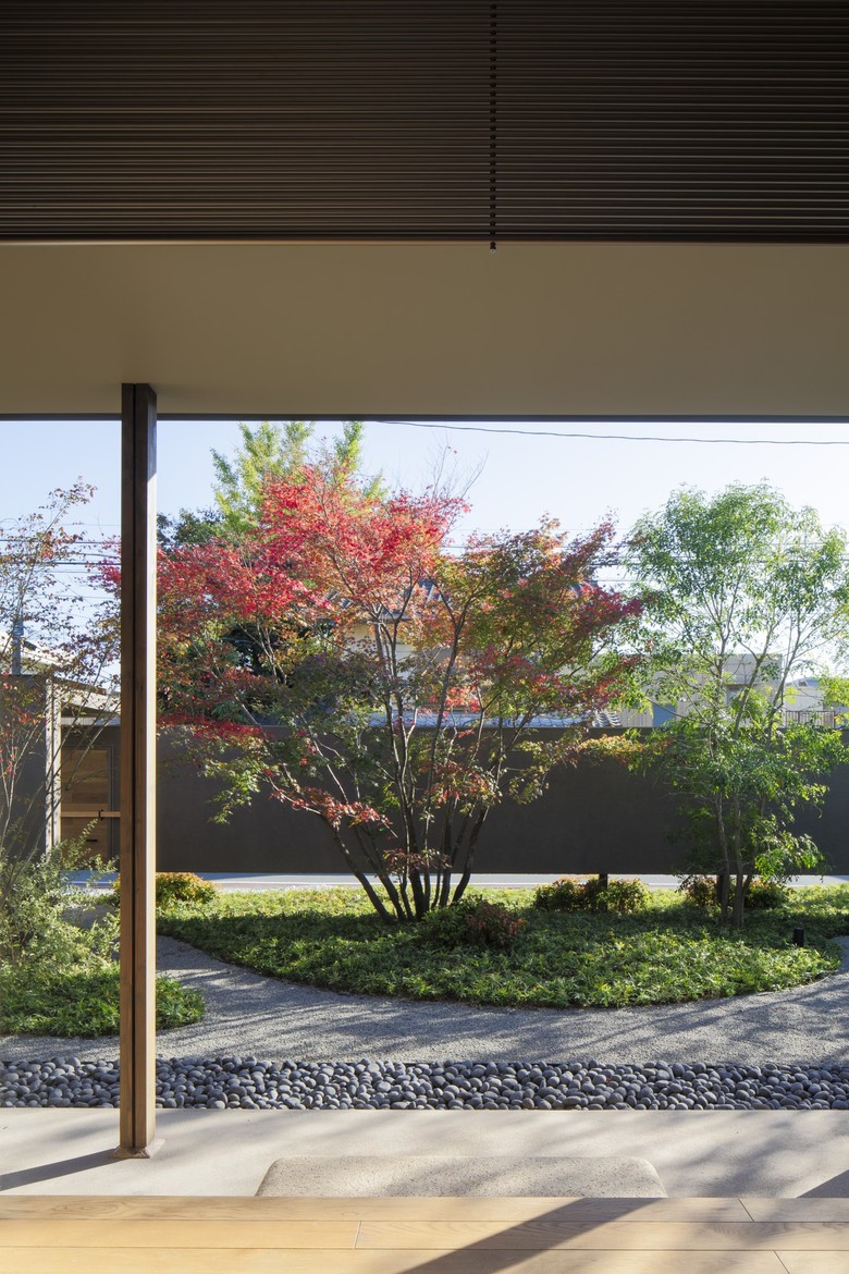 That the gardens contribute not only to the interior spaces but also to the town itself. The client, a community leader with a deep affection for the area, is constantly thinking about how to contribute to the community. The greenery of the south-side garden overflows toward the road, benefitting the town in that way, and during festivals the gate can be opened so that the entryway serves as a public rest area welcoming in neighbors and friends. In this way, the design promotes connections with the community and its residents.