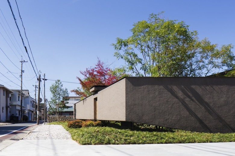 The building site is located midway between the train station and the town’s famous Tenmangu shrine. Despite its downtown location just ten minutes on foot from the station, the lot is remarkably large. Another defining feature is the contrast between the busy pedestrian and automobile thoroughfare on the south side, and the sweeping views of Tenmangu and the mountains on the north. By locating the building in the center of the lot and creating very different gardens on the north and south sides, we attempted to connect the residence to the town in diverse ways. Specifically, the south side features a “floating” wall whose color harmonizes with the trees in the garden, evoking a feeling of openness toward both the dynamic townscape on the south side and the interior of the home.