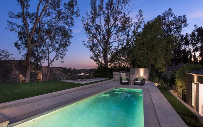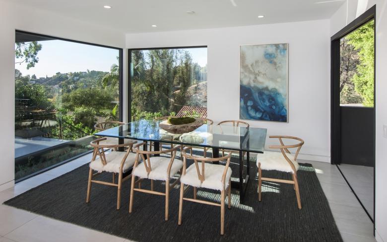 The home features glass walls by Fleetwood that open the house up to the Hollywood sign view and emphasize indoor-outdoor living, as well as Poliform kitchen and master closet, and Porcelanosa tile.