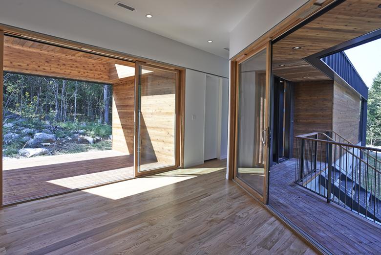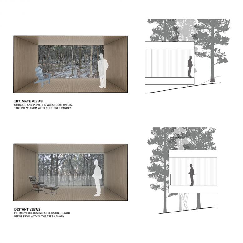As the design developed pier footing options were explored which allowed portions of the building to be elevated above the landscape to limit the site impact and take advantage of the natural slope of the site.  In order to maximize the access to views from the building’s three main zones the public space was dislocated from the primary linear form and extended out over the landscape on piers, which allowed rock outcroppings below to remain intact while placing the public space within the tree canopy oriented towards distant views to the river and mountains beyond.