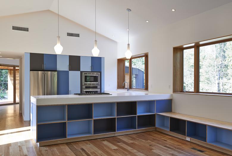 The completed building does not differ from the designed version in its form or overall design intent.  The biggest changes from design to construction dealt with material specification changes, which resulted from our goal to keep the project within a modest budget.  These changes included the use of standard residential concrete formwork in lieu of board formed concrete and a switch from standing seam anthracite zinc panels to a more conventional painted metal standing seam panel.  These changes were not unanticipated; we’ve learned from other projects that an exploration of the ideal material alongside those acceptable alternatives is an important part of the design process and not something that should be left to the sometimes-unpredictable value engineering process that often precedes construction.