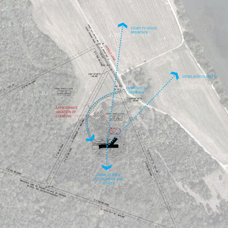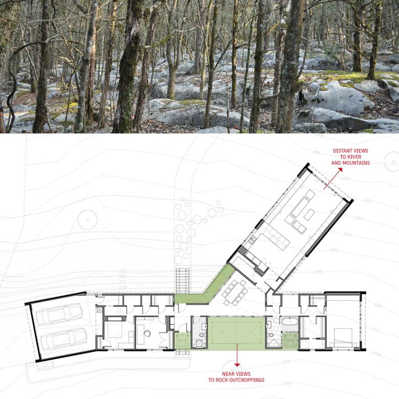 The primary site constraints were clearly visible in the form of moss covered rock outcroppings scattered throughout the wooded hillside.  Initial conceptual design efforts focused on options, which limited the impact on the site while taking advantage of the unique opportunities presented by this rugged landscape.  Early schemes were narrow and linear, weaving around the rock outcroppings and following the site’s contours in an effort to limit the elevation change from front to back.  This siting also allowed for a series of framed views connecting the house to both the immediate landscape (rock outcroppings) and distant landscape (the Holston River and the mountains).
