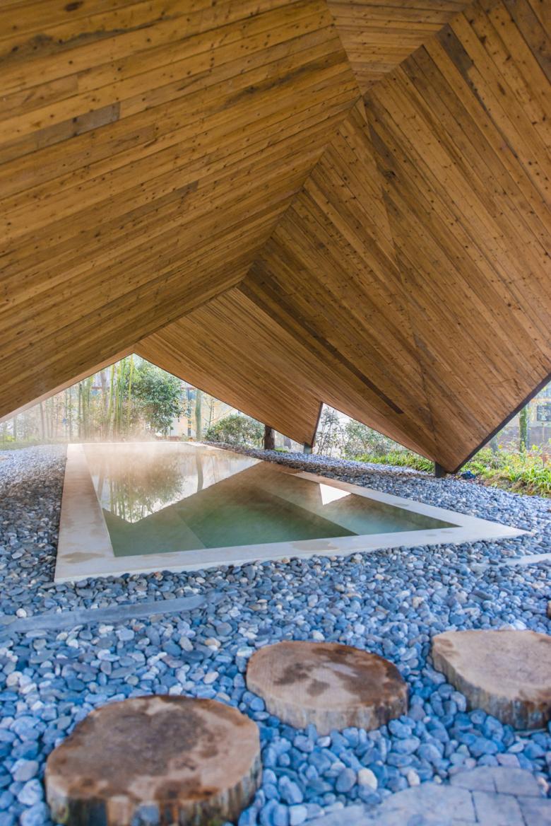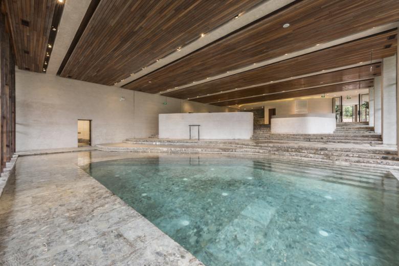 The central spa facilities are organised around a small hill with detached buildings united by a connecting roof. Several outdoor pools offer a variety of sensations, with different concentrations of minerals in the water or different temperatures intensifying the experience in the monsoon-influenced humid subtropical climate of the region.