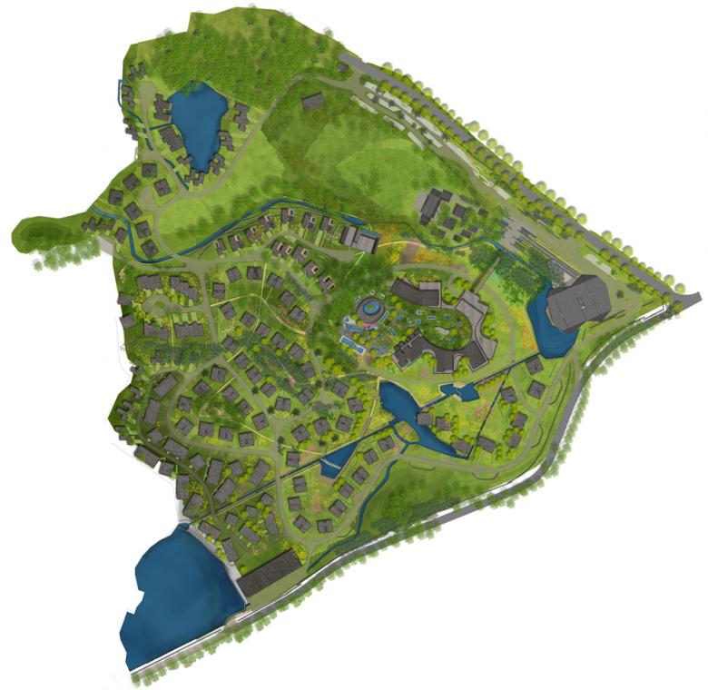The different functions, including restaurant, tearoom, conference room, bar, sauna, gym and hot spa, are layered on three floors, resulting in a very complex overall form at the heart of the spa landscape. The building’s orientation towards all four cardinal directions and the spatial openings and open circulation around the hill and through the pools, offer many views across the landscape near and far. As the trees grow, the buildings will soon disappear into the surrounding landscape park.