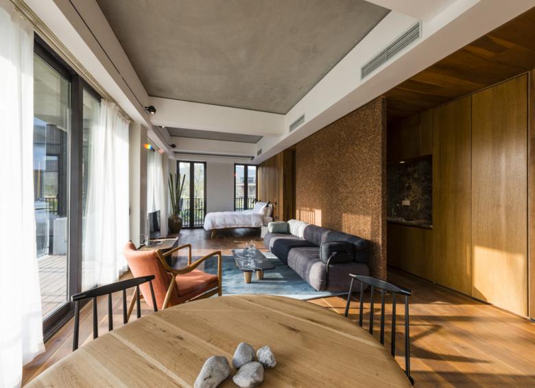 For the interior design the architects used natural materials like wood for the ceiling, built-in-cupboards and floor, which is partly covered by rugs. Much of the furniture was custom-made for the project.