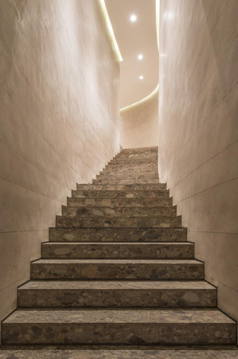 The materials reflect the buildings’ close relationship to the surrounding countryside. Part of the walls are made from clay mixed with pebbles, or stained timber. However, the core material is a local river stone, a terrazzo-like conglomeration of pebbles shaped over time by water. After cutting the material into slabs, the pebbles come to light in various sizes and different shades of natural colours. This stone was used indoors and outdoors for flooring, pools, seats and benches, water canals, landscape walls and even as inserts into the concrete of the roads.