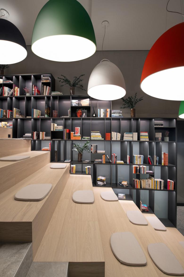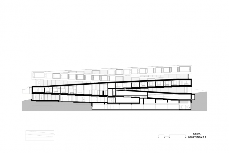 From the street, the hotel looks like a single slab, with the four lower floors tucked into the landscape below. Wooden louvers provide shading. The wooden slabs step down from the road to the valley. The interiors, designed by AUM Pierre Minassian from Lyon, France, draw inspiration from the indoor/outdoor vernacular. From the lobby, the design becomes more sinuous and rustic, with glass, concrete, stone, and wood. One level below are a bar, spa, conference center, and two restaurants; the path terminates in an in-house art library for hotel guests. The five slabs form a ramping corridor as a continuous interior path. Some 86 photovoltaic panels on the roof provide part of the building’s electric energy, while wood is used for heating the building. The hotel earned the Swiss Minergie-ECO label for low-energy buildings.