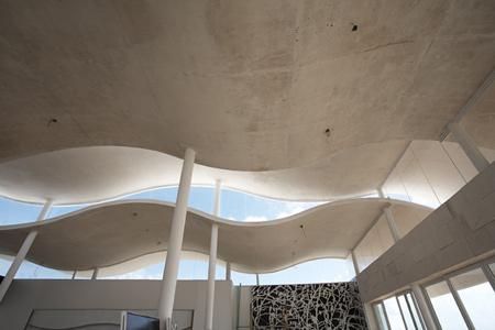 The restaurant, with its striking copper roof, is located between the jungle and the mangrove swamp, with views of a group of villas alongside the lagoon. The banquet and meeting rooms, the lounge, and the terrace bar all form part of this section of the complex. The main path, which leads to the beach club -roofed in three white concrete slabs that evoke waves-, winds back past a sun deck and a seaside swimming pool, a restaurant zone, and a series of cantilevered terraces.