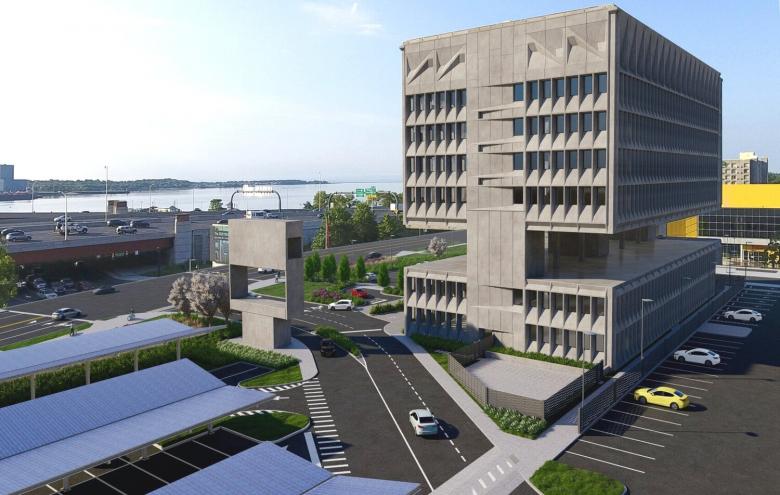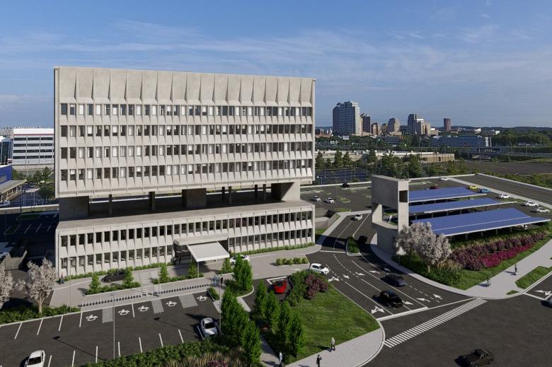 The project is the adaptive reuse of the mid-century-modern former Armstrong Rubber Company Building, designed by Marcel Breuer in 1969, into a new, 165-room boutique hotel and conference center that will be the first net zero-energy hotel in the United States.