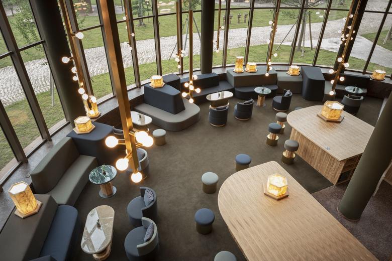 The design strategy follows an attitude that remains comprehensible in both the small and the big decisions and is reflected in a 'landscape' of things, which reinforces the character of the place with restraint. The lobby could be called a landscape of furniture, the signs are made of organically shaped wooden elements and the clothes of the employees are layered according to the season.