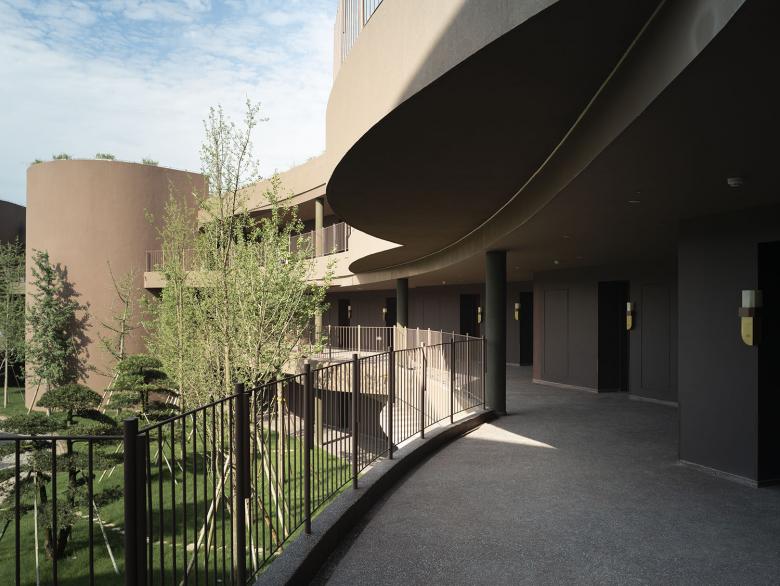 The central courtyard is planted with trees and abstract-looking plants, such as cut black pines that look like giant bonsais, ginkgo trees with yellow leaves in autumn and winter plum trees with their straight centripetal branches. The landscaping around the hotel is more natural, mainly with wildflowers and grasses as well as refined cut pines.