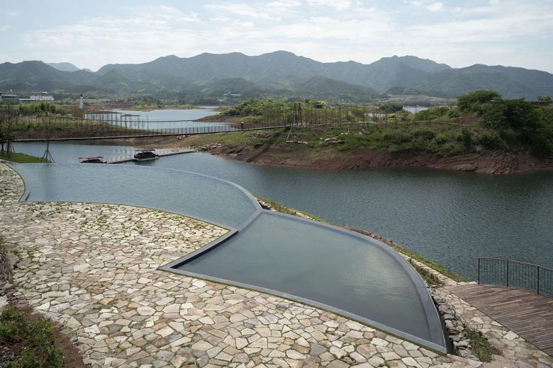 The Thousand Islands Lake (Qiandao Hu) was created as an artificial reservoir almost 60 years ago. The water masses drive the Xin’an river hydroelectric station, completed in 1959. The water covered countless villages and an ancient city, which is still well preserved today. The lake’s name comes from the fact that the sunken hilly landscape created over 1000 islands, which turned the area into a recreational landscape with an overwhelming natural beauty. The team of KUU around Satoko Saeki and K.M. Tan designed a four-storey resort hotel with 99 rooms on the picturesque lakeshore.