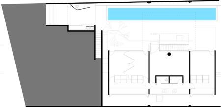 A concrete staircase leads to a terrace that provides a view of the house on the plot of land, below street level, and leads into the lounge and kitchen. The spaces blend in with the trees, small valley, gardens and swimming pool located at the level of the terrain. The house incorporates the outdoors: a sliding glass door opens the lounge onto the terrace, creating a single space. The bedrooms and lower courtyard are also linked to the lower level. The kitchen is connected to the main structure, making the lower spaces available for their different uses.