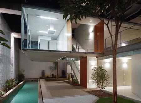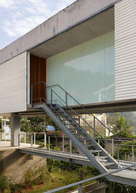 The office, consisting of two flagstones structured by a large top beam, supported by two pillars, is the only volume visible from the street. The house was designed on the base of the topography and landscape. The finishes are simple: white concrete floors and white  Portuguese mosaic.