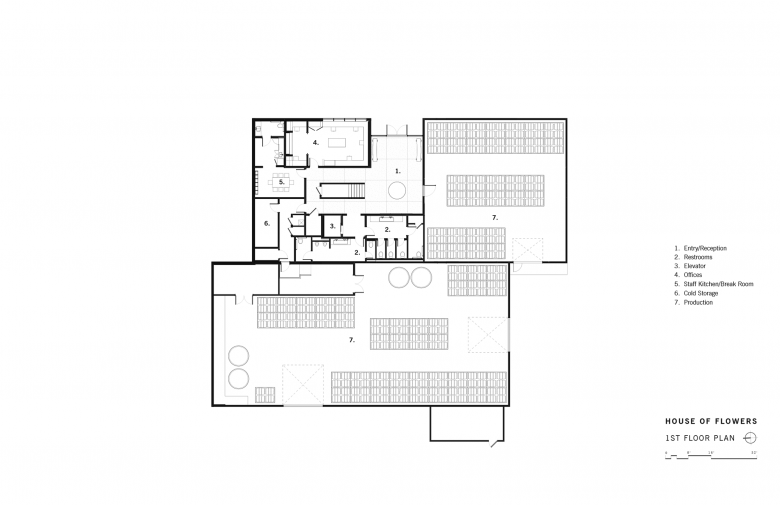 Initially, the clients conceived of this project as more of a garden project with a light remodel of the existing building, fresh paint, etc. However, as we worked closely with them to understand the program and develop the vision for the first widely accessible home for the Flowers brand, they realized that the project would be more extensive. The turning point came early in schematic design when we suggested that to achieve their goals for the guest experience, half of the roof of the existing building should be raised by three feet so that guests would have a more connected and open relationship to the landscape. Without this change, the low seven foot tall doors and windows created a space that was dark and internal.