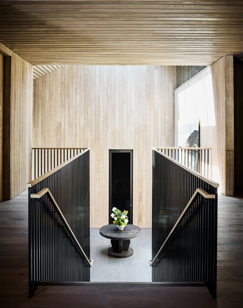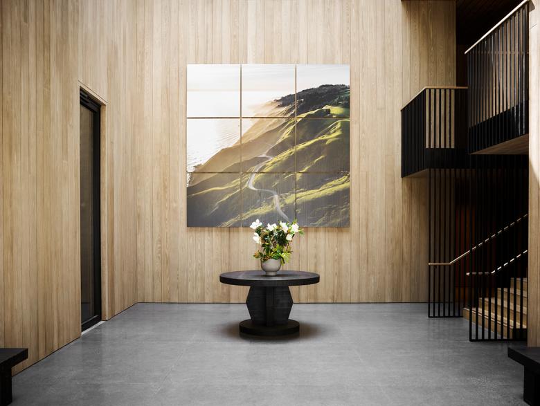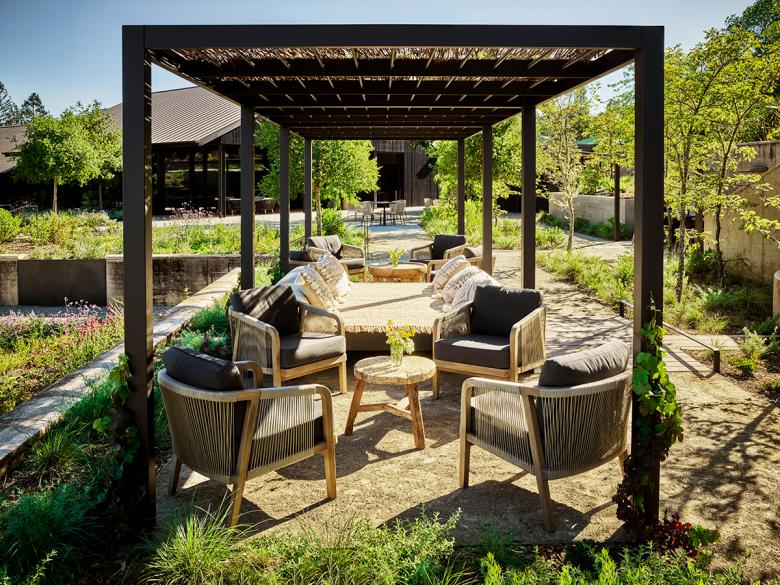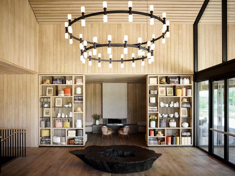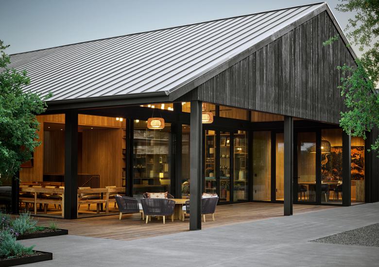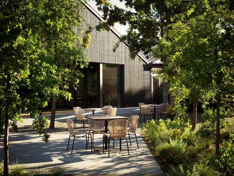 The renovation knits building with topography, resulting in a multi-level facility that preserves the modest vernacular forms while providing seamless access to the stunning views and gardens afforded by the hilltop. The airy hilltop structure serves as a transition to the spacious gardens and provides sheltered seating and amenity spaces, including an outdoor wood-fired oven. The interiors are bright thanks to bleached cypress siding, completing the yin-yang (dark-light) relationship of outside to inside. “The architectural expression is understated,” notes Mike McCabe, lead principal at Walker Warner Architects. “It isn’t about making a statement. It’s about creating a place that can unify the values that are important to the Flowers’ brand—celebrating nature and local context with what’s important to the site and the community.” The desire, note the Flowers owners, was to “create an environment where guests feel like they are entering our home, experiencing wines crafted without compromise and shared without pretension.”