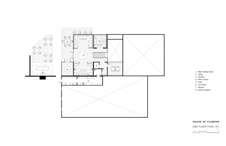 The visitor experience was reconfigured and expanded to include a variety of intimate gathering areas to savor Flowers’ Sonoma Coast wines both inside as well as outside. Upon entering the visitor center, guests are led up the main stair to the primary tasting room on the second level which includes the dining room and the living room areas as well as more private spaces for VIP guests. The gardens are framed by existing refurbished rammed-earth walls that bring the experience into sharper focus. The resulting spaces unfold as a series of quiet eddies intended for gathering, tasting wine, and celebrating nature. The site occupies the boundary between the gridded vineyard and agricultural fields of the Russian River and is situated amongst the oak-grassland foothills leading up to the coastal redwood forests that surround Flowers’ estate vineyards on the extreme Sonoma Coast. The terraced gardens feature plant communities indicative of each surrounding ecological typology. New board-formed concrete walls were added to the landscape as needed, serving as a counterpoint and augmenting the series of exposed archaeologies. Together, landscape and architecture combine to provide a quiet refuge, a place to celebrate community and friends through the experience of wine.